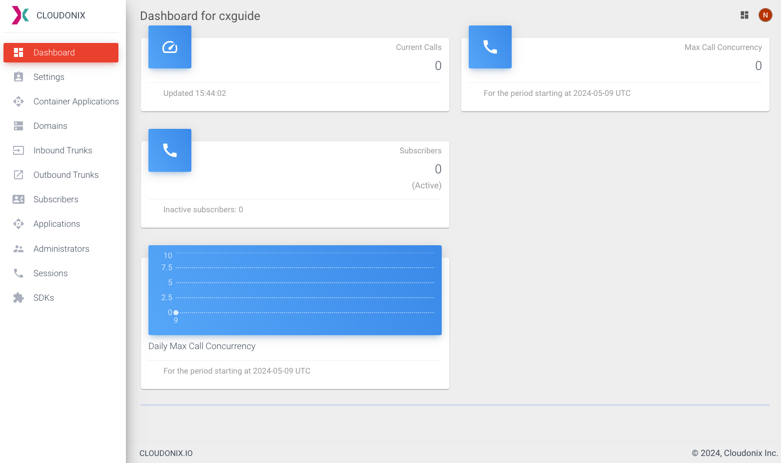 Once you've finished creating your Cloudonix account, and you're logged on to the cockpit, your screen should look like the following: