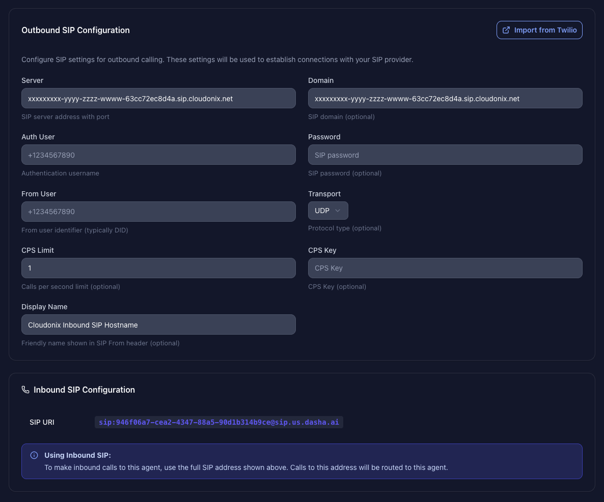 | Domain | Your Cloudonix inbound SIP Hostname. | eg. aaaaaaaa-bbbb-cccc-dddd-xxxxxxxxxx.sip.cloudonix.net |