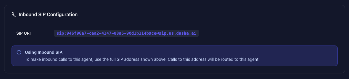 Logon to your Dasha dashboard, and create a new voice agent. Then select the Phone and SIP menu option, the following screen will appear: