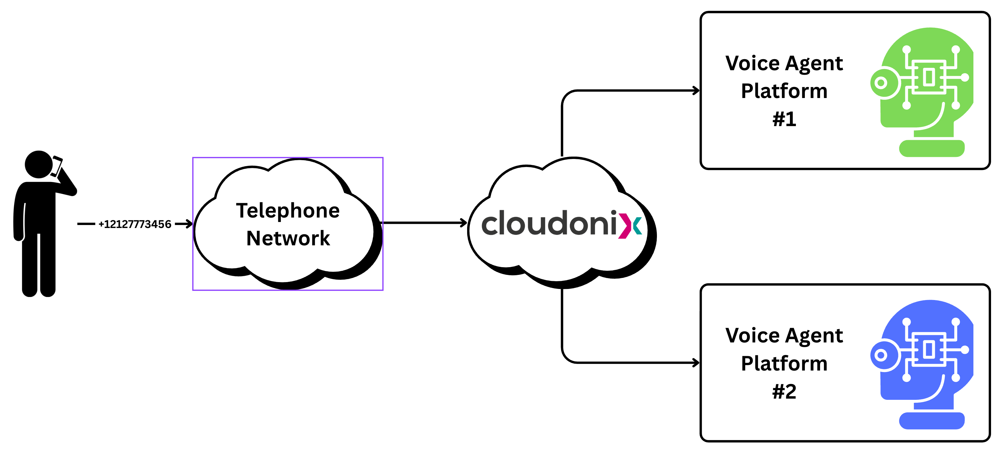 When a phone number is assigned to a voice agent, it is assigned to it by the voice agent provider—and it is available on that system only. With Cloudonix, you can connect your own phone numbers, from your telephony providers of choice, or even the customers' phone system. By doing so, customers can easily use multiple voice agent platforms, to service the same inbound phone number - enabling fault-tolerance for their voice agent, A/B testing of voice agent platform performance, and more.