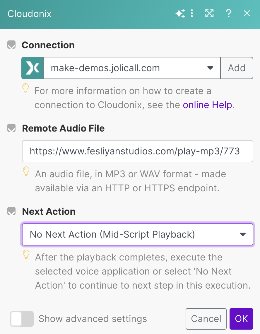 Remote Audio File | A URL to the MP3 file to play. You may specify multiple URLs, they will be played in sequance. |