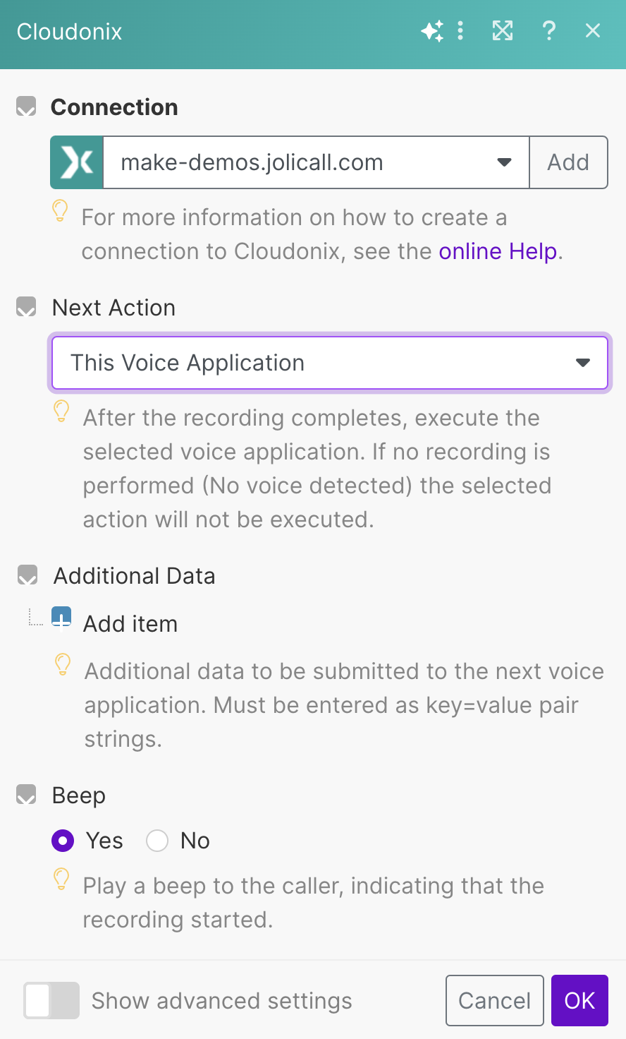 Beep | Play a short beep tone to the caller, indicating that the recording started. (Default: true) |