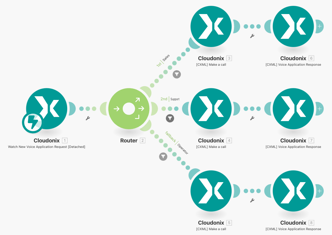 When a call initates a call to Cloudonix, the Voice Application to be executed first, will be the Main Menu. Once the caller clicked the keypad (or lack of selection), the call control will be passed to the Menu Processor scenario, which will in turn, process the request and route the call accordingly.
