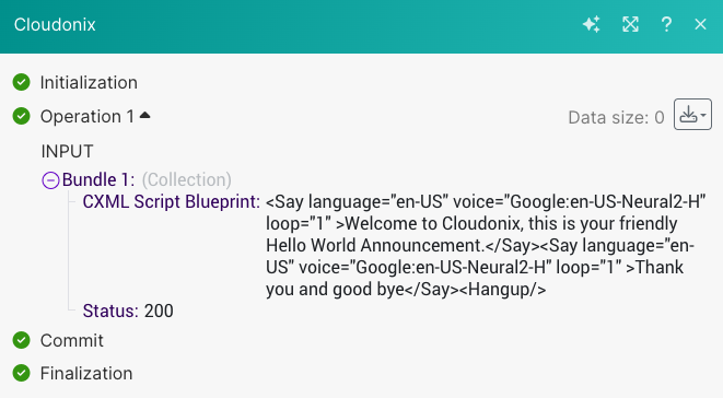 <Say language="en-US" voice="Google:en-US-Neural2-H" loop="1">Welcome to Cloudonix, this is your friendly Hello World Announcement.</Say>