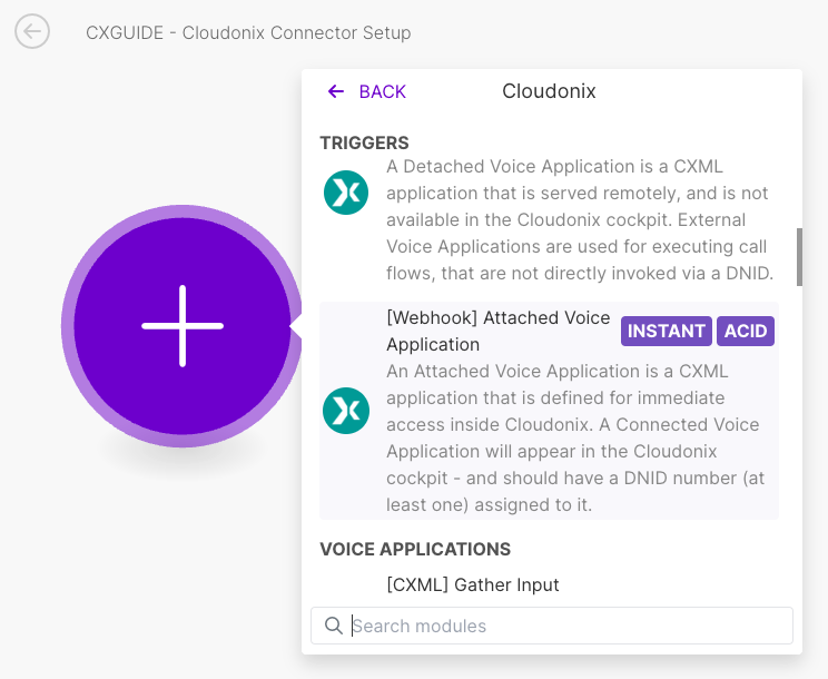 After you've installed the Cloudonix make application into your Make.com account, in order to connect with Cloudonix, you'll need to create your first scenario. Click the Create a new scenario button to create a new scenario and search for the Cloudonix application. Select the Attached Voice Application option: