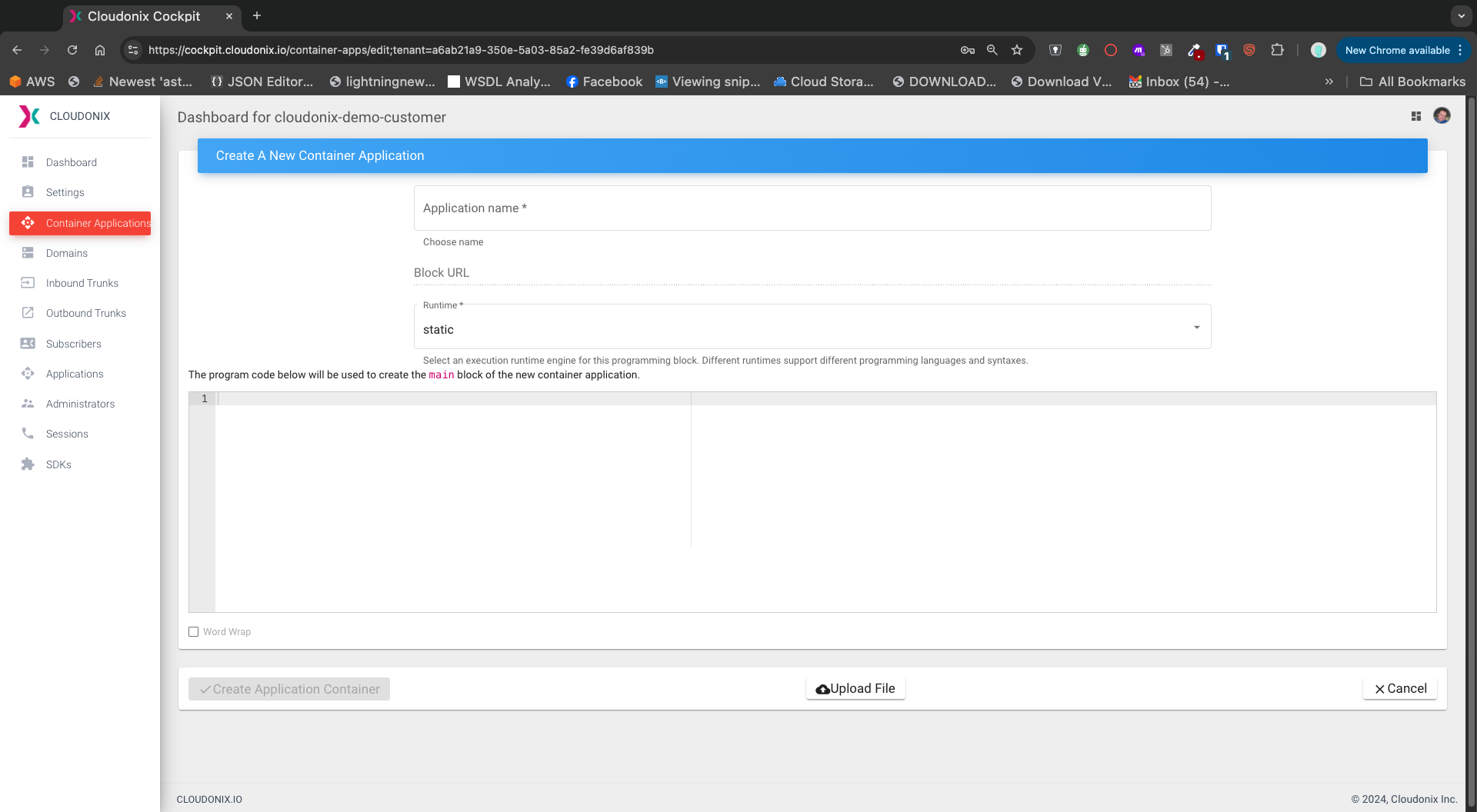 For now, we shall create a simple container application, using a static runtime. Use the following information to fill the container application form: