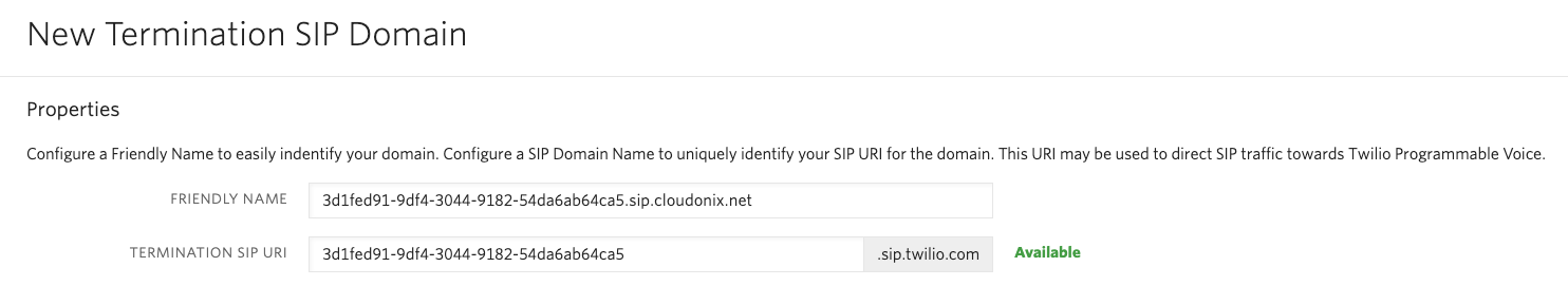 Friendly Name | Use your Cloudonix domain name for easy usage later on. | Eg. cloudonix-demo-customer.cloudonix.net |