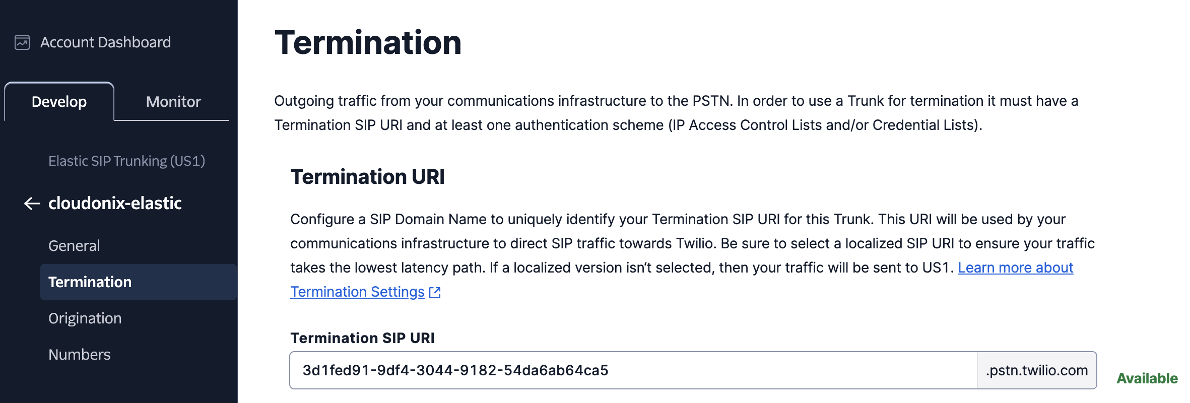 Give your new trunk a meaningful name and click Create. Now, from the left menu, select the Termination option. In