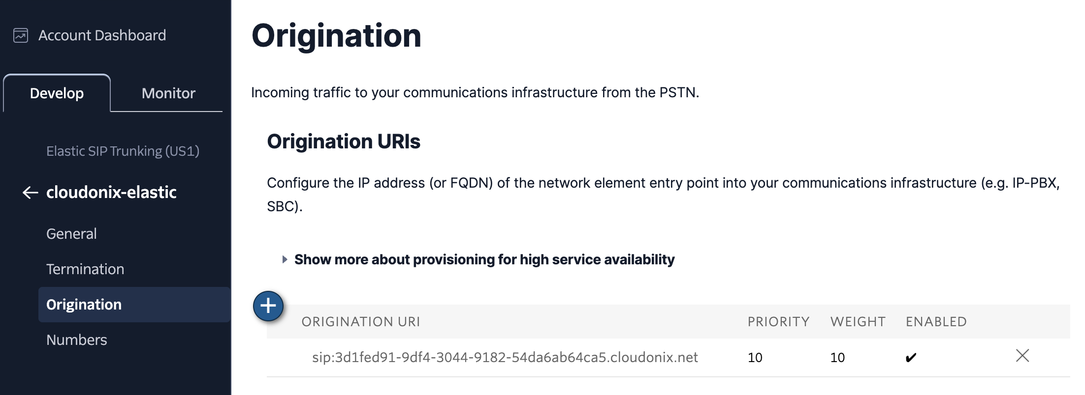 Now, click the blue plus button to add a new SIP origination target URI. The following screen will appear: